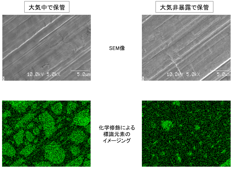一例として、大気非暴露環境と大気中で保管した金属表面をFE-AES(オージェ電子分光法)で比較分析しました。分析の際には、化学修飾法を用いて金属水酸化物に標識元素を含む成分を誘導体化し、標識元素の分布を検出することで水酸化物の存在領域を可視化しました〔図1〕。その結果、大気非暴露で保管した金属では、水酸化物に由来する元素のシグナル(緑色の箇所)が少なく、金属表面の劣化進行を抑制していることが示唆されました。