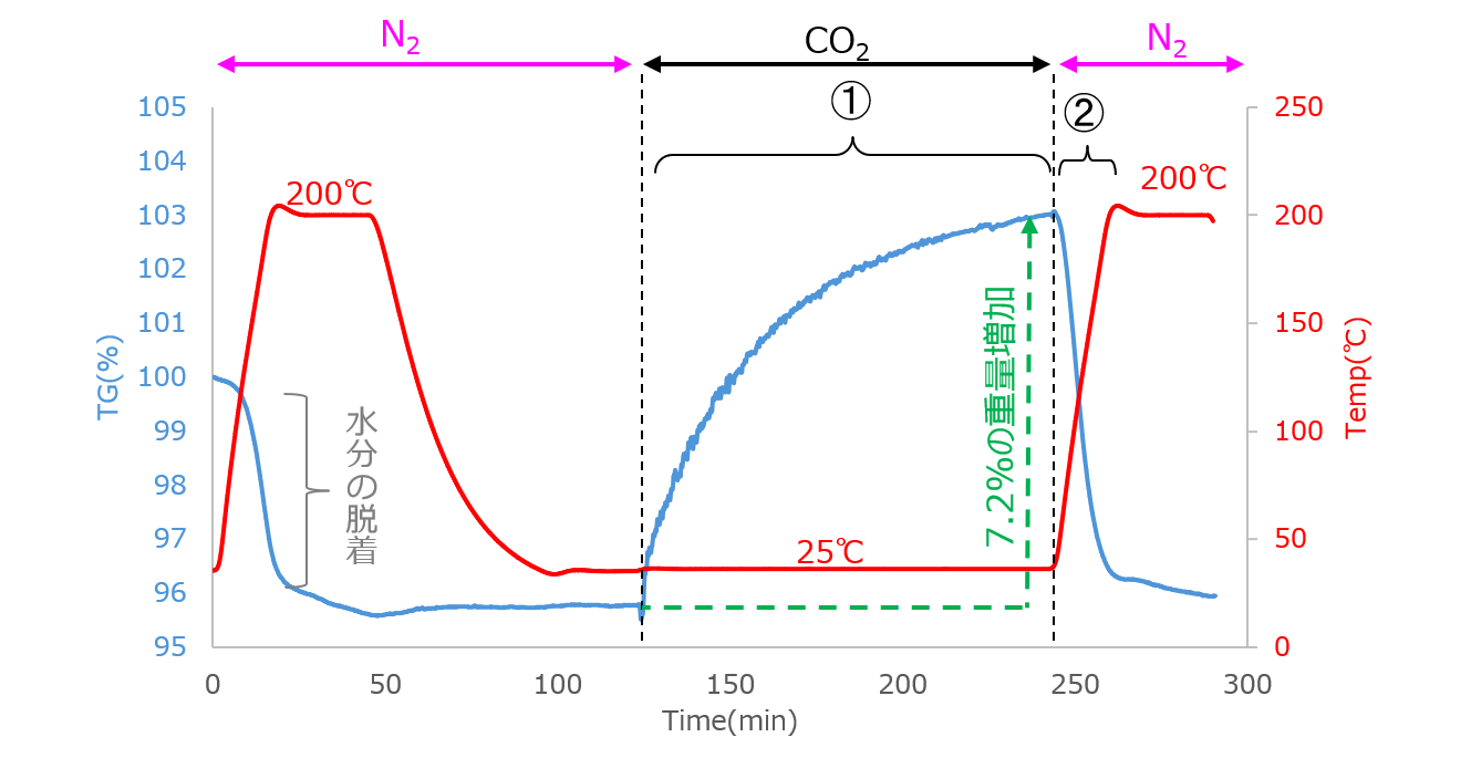 CO2雰囲気下でCO2の吸脱着挙動を評価するためにモレキュラーシーブを測定したところ、時間とともに重量増加が確認され(図1中の①)、CO2分子が細孔内部へ吸着していく様子を定量的に捉えることができました。モレキュラーシーブは微細な細孔を多数持つ材料であり、表面吸着だけでなく内部細孔への多層吸着が進むため、今回得られた段階的な重量増加は材料特有の吸着メカニズムを反映したものと考えられます。続いて、吸着後の試料をN2雰囲気下で加熱したところ、TGは温度上昇とともに重量減少を示し、吸着していたCO2が脱離していく挙動を明確に捉えることができました(図1中の②)。このように、CO2吸着時の重量増加と、加熱による脱離挙動をTGで一貫して評価できることは、吸着材の性能比較、使用条件の最適化、さらにはCO2分離回収プロセスの開発に大きく貢献できる手法であると考えられます。TGによる吸着・脱着評価は、一度の測定で吸着量、保持力、再生性といった主要パラメータを取得できる点で、CO2吸着材開発に非常に有用です。
