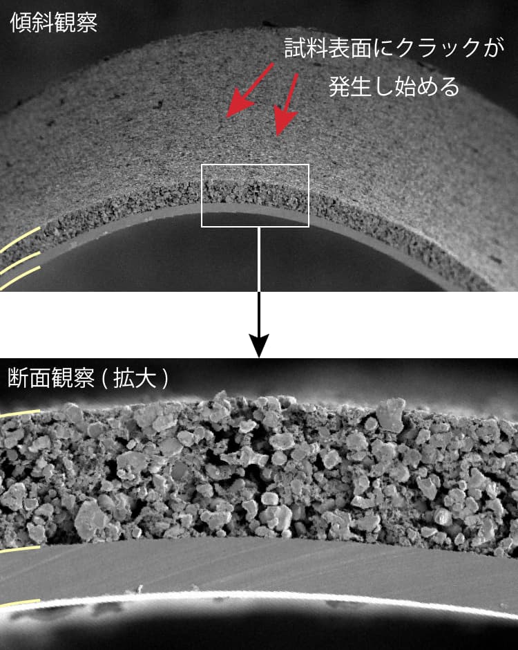 今回はリチウムイオン電池の電極を屈曲しながらSEM観察し、クラックの発生する様子をin-situ観察しました。